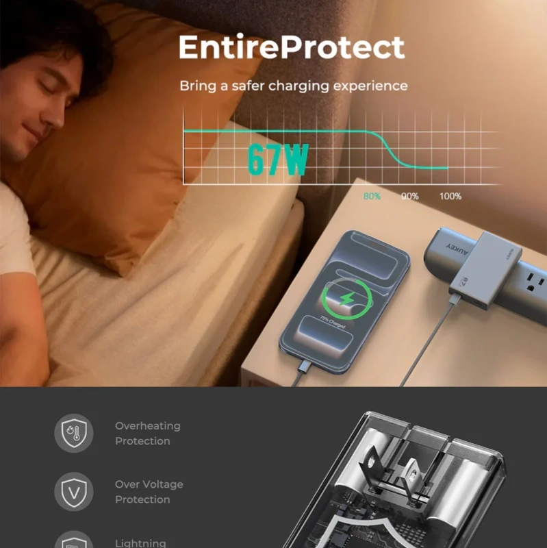 The integrated Gallium Nitride (GaN) chip provides efficient power conversion, reducingheat and allowing for a more compact design. Enjoy reliable performance with cutting-edge technology