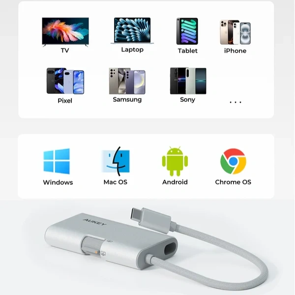 The Aukey UH-CUH01 USB-C Hub is a compact and versatile connectivity solution designed to expand your device’s capabilities through a single USB-C port. It allows you to connect an external display via HDMI for a larger viewing experience, attach USB-A devices like keyboards or flash drives for seamless productivity, and simultaneously power your laptop with up to 100W fast charging through its USB-C Power Delivery port. Featuring a convenient screen on/off switch for quick display control, this hub is ideal for office work, presentations, home setups, and travel, offering reliable performance in a sleek and portable design.
