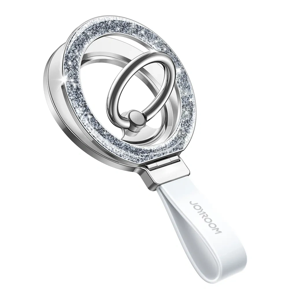 The Joyroom Magnetic Ring Holder combines style and function with its high-quality silver reflective finish and fused design. With a super strong magnetic force – up to 4.0 kg with the metal ring – it ensures a secure hold. The 360° rotatable ring and 120° foldable stand offer versatile angle adjustments for hands-free use. Built with a durable metal spindle, it can withstand over 3,000 cycles for long-lasting performance. The additional silicone strap provides a comfortable, handheld design, making it a practical and stylish accessory.
