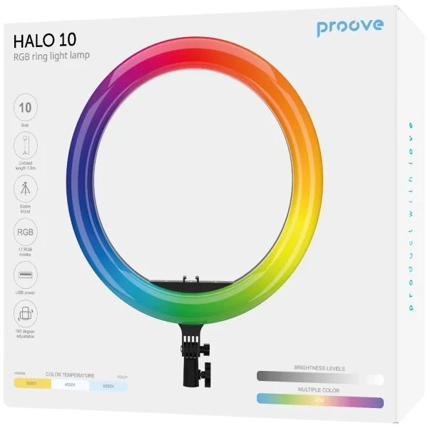 The Proove Halo 10 RGB Ring Light Lamp is a stylish, multifunctional LED lighting solution designed to provide bright, adjustable illumination with color‑rich RGB effects. Featuring a 10‑inch ring with 168 LEDs, this lamp offers a wide range of lighting modes and a full spectrum of colors and white light temperatures. It includes a height‑adjustable tripod (up to 1.6 m) and easy controls, making it perfect for creators, streamers, vloggers, beauty tutorials, or mood lighting in any space. Made with durable materials, it combines aesthetics with practical lighting performance.
