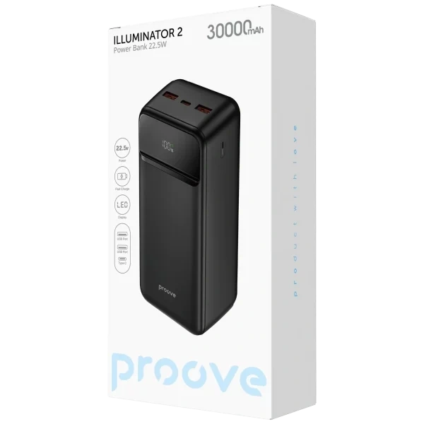 Proove Illuminator 2 is made of two types of fire-resistant plastic: ABS and PC. Its minimalist design seamlessly integrates with a display that shows the battery level. Supports charging for various devices through universal USB-A and Type-C ports with a maximum power of 22.5W. Ensures fast charging with technologies such as AFC, FCP, SCP, PD, and QC2.0-3.0. For enhanced safety, Proove Illuminator 2 is equipped with overload and short-circuit protection. It prevents overheating, voltage surges, and excessive current flow, ensuring stable and reliable operation.